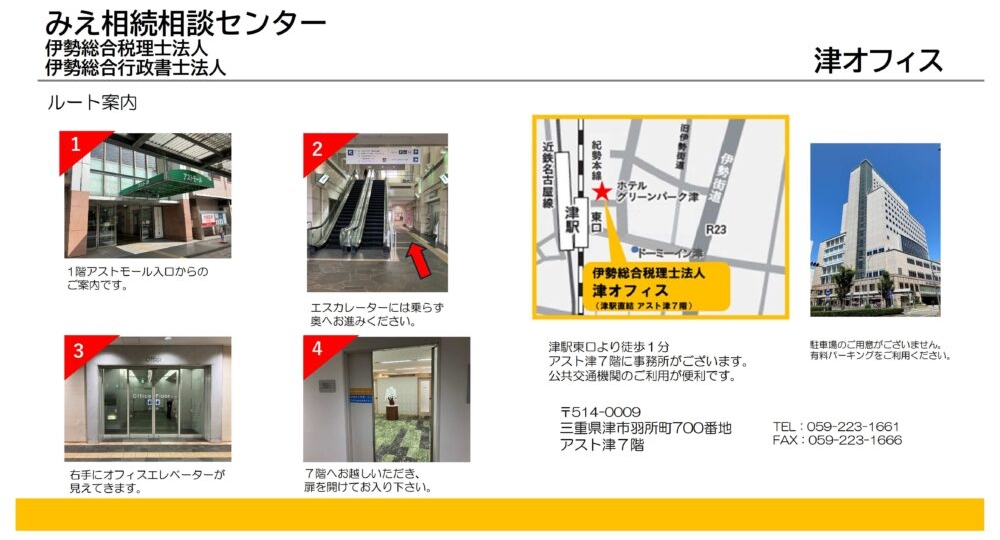 津駅東口から徒歩1分ほど、アスト津7階(津駅直結)に事務所がございます。