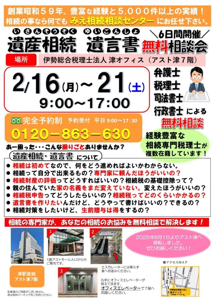 R8年2/16(月)~21(土) 相続無料相談会(津オフィス)開催!